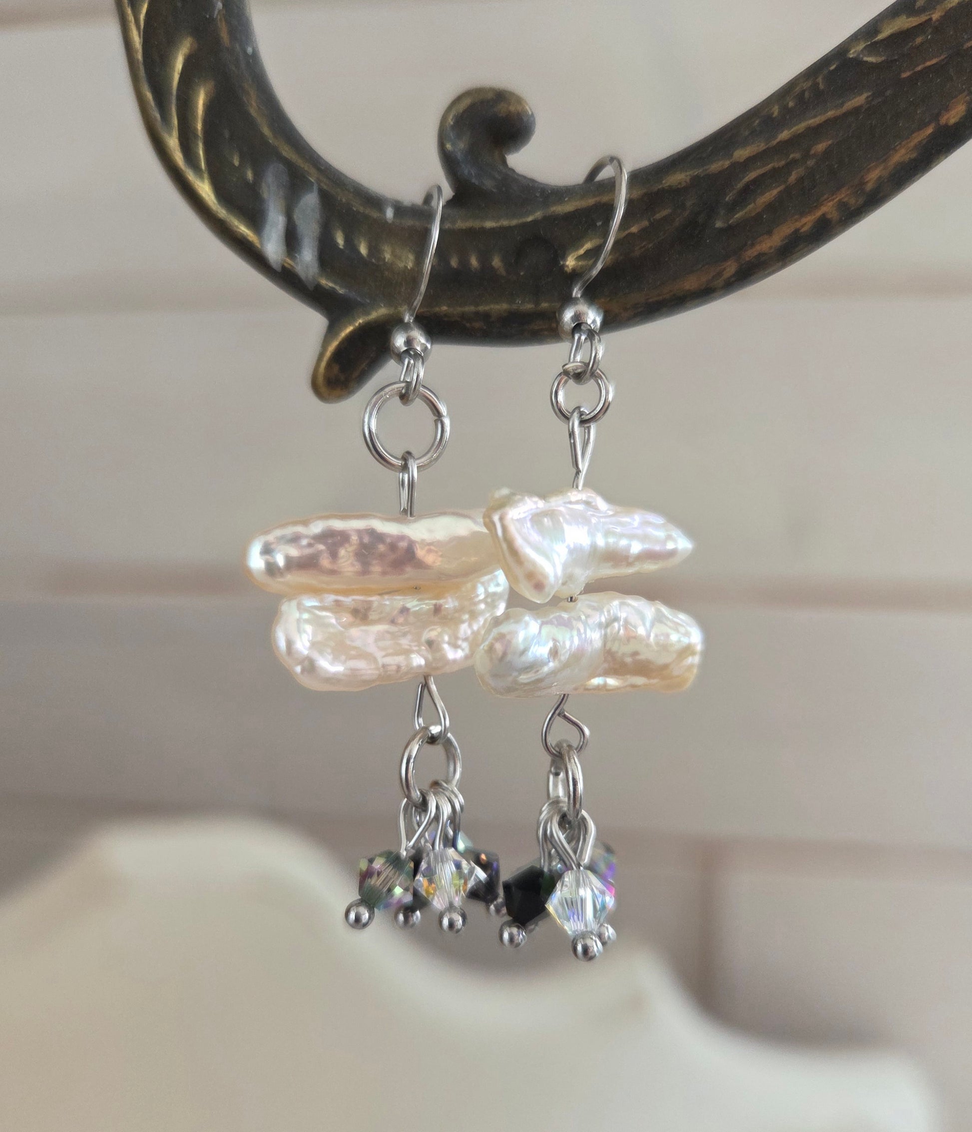 Crochets en acier inoxydable, perles d'eau douce Biwa et cristaux Swarovski. Vraiment trop cute!!! Le choix des perles peut varier.