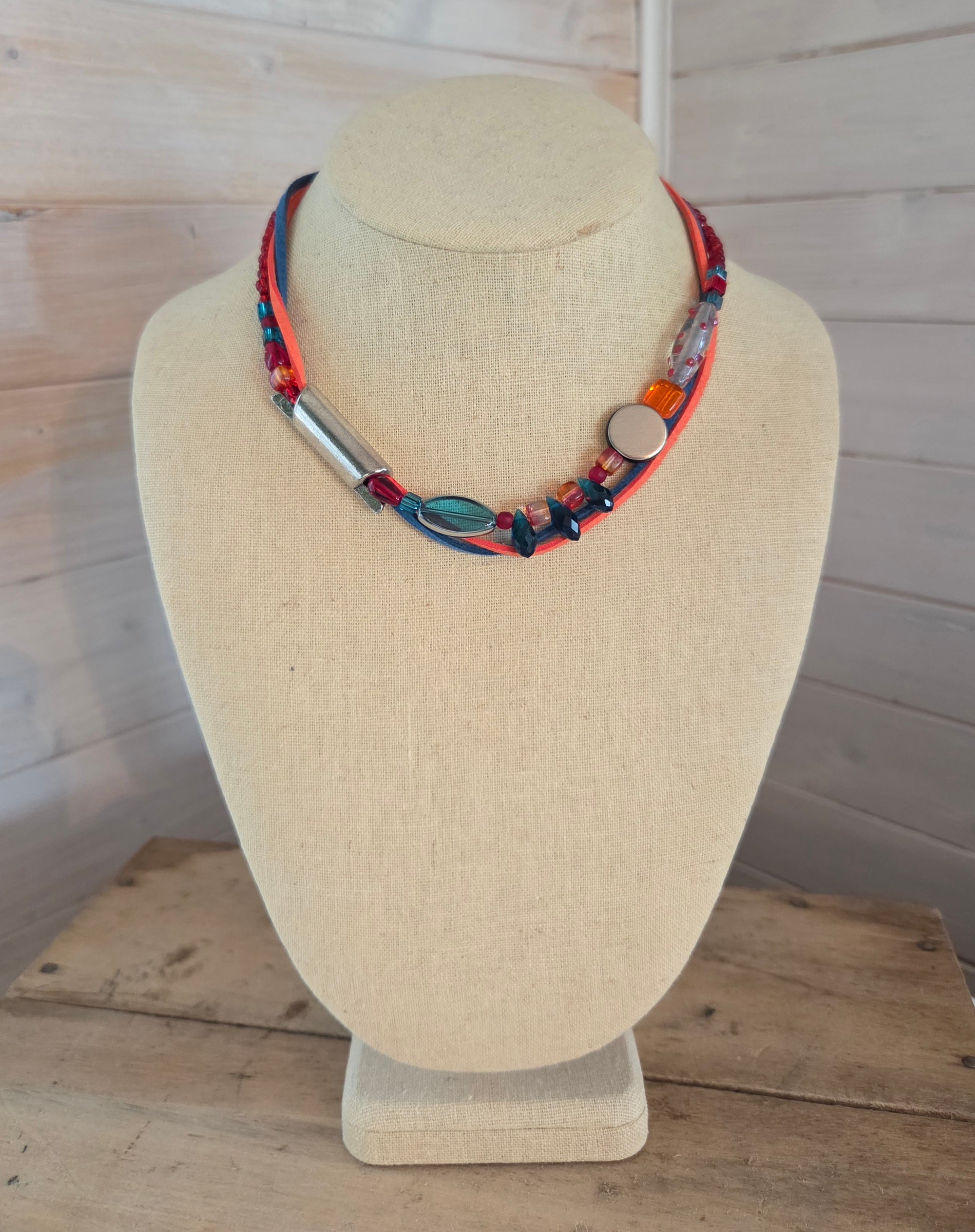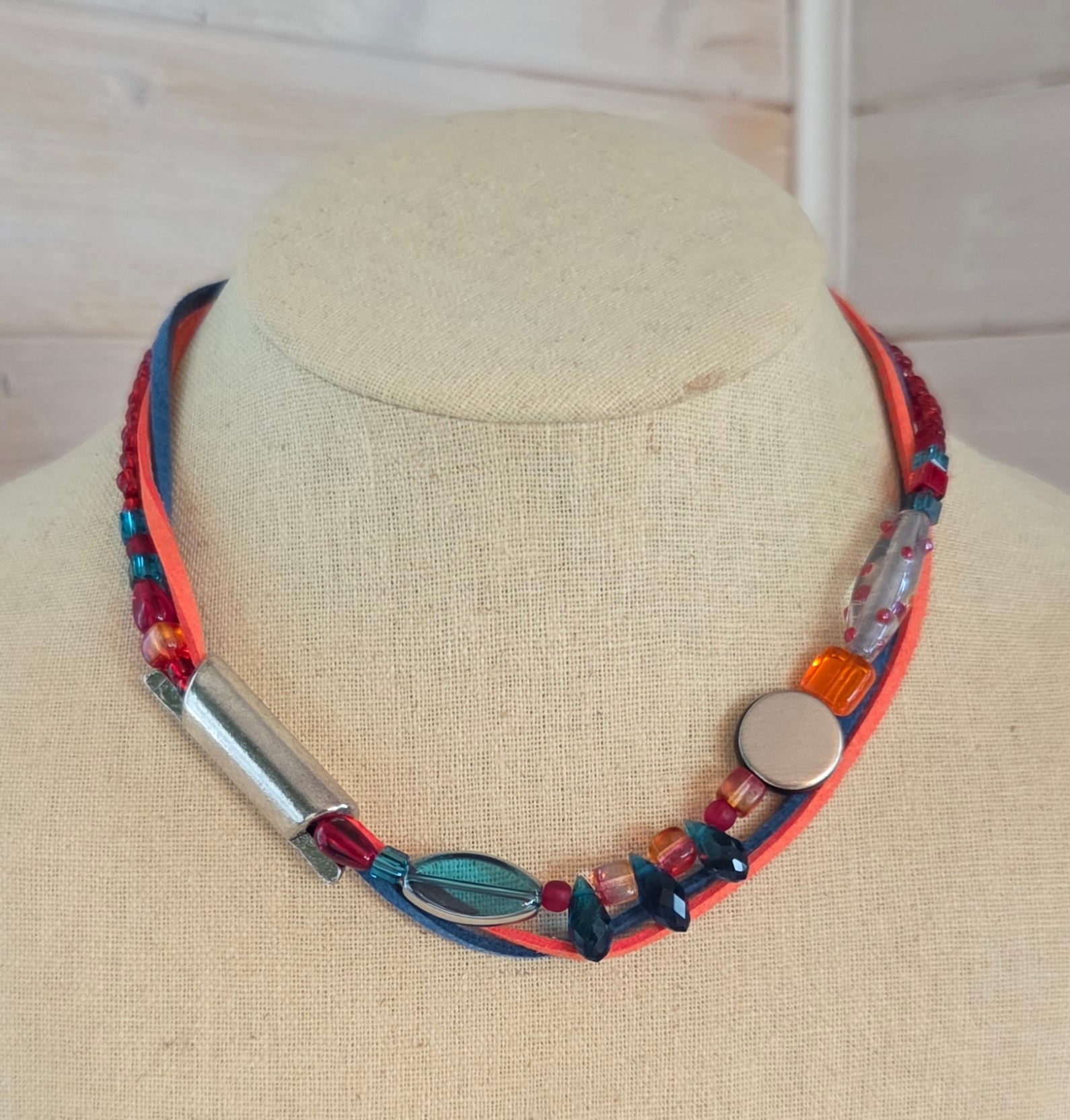 Collier avec cordons de faux suède orange et bleu canard, pièce de métal, perles de verre et cristaux. Une création unique!