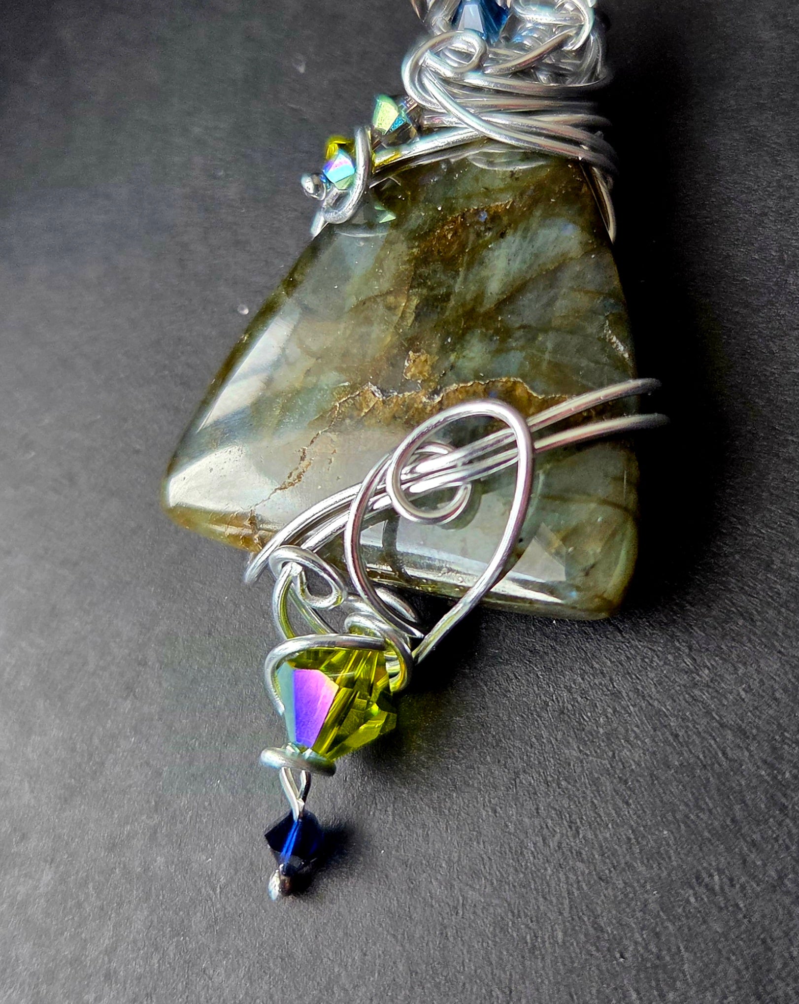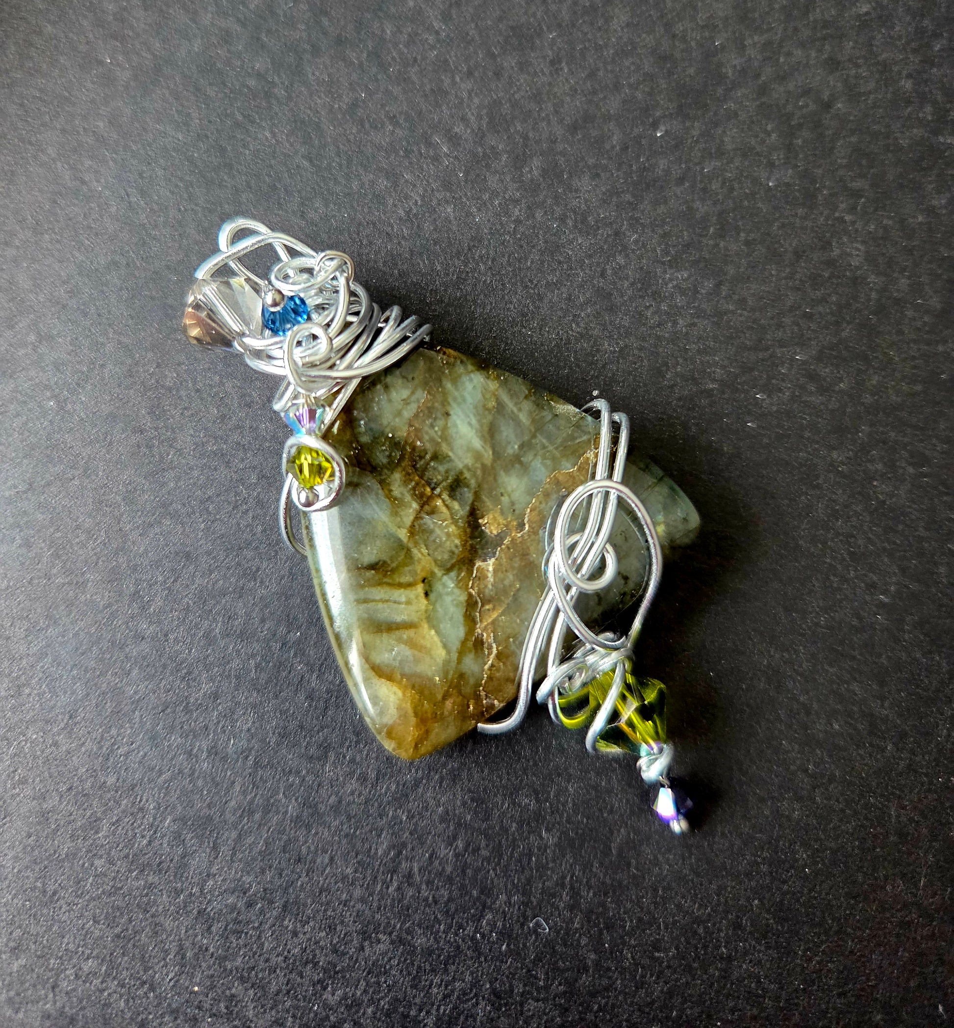 Magnifique pendentif de labradorite, fil d'aluminium et cristaux Swarovski. Une pièce unique!